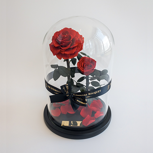 Inspired by a timeless classic fairytale, The Eternal Bouquet presents the double-take of our signature Enchanted Rose dome, a real rose encapsulated in a glass dome, preserved to last for over a year with zero water or maintenance. Our beautiful duo roses are the perfect gift or addition to your home, office, event and function. Choose an option to personalise your glass dome and surprise your family, friends or significant other with a beautiful gift that is curated with love. Double the memories and double the love today!