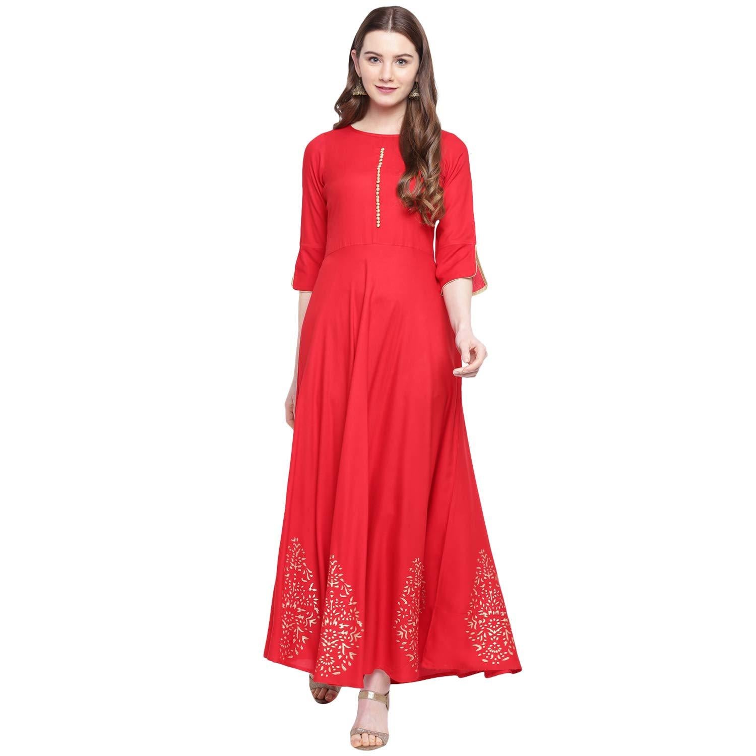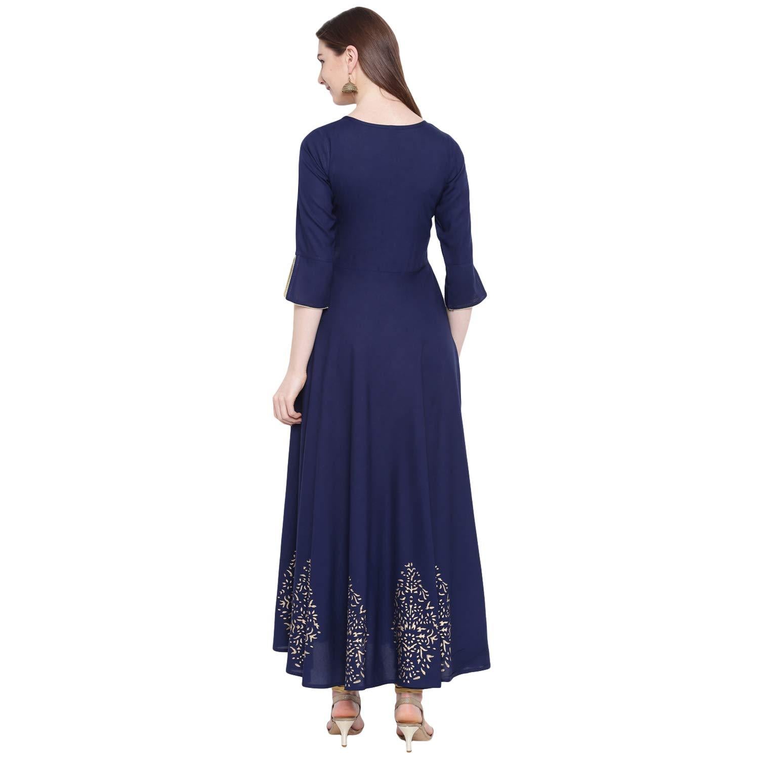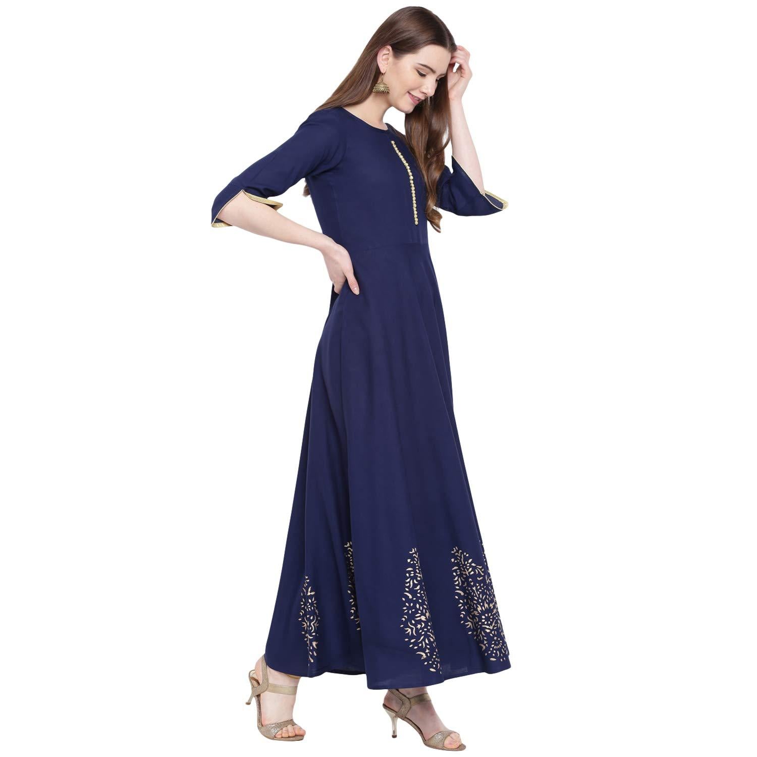 - Material:- Rayon || Style & Pattern :- Hand Block Gold Printed Kurta Dress || Length:- Ankle Length