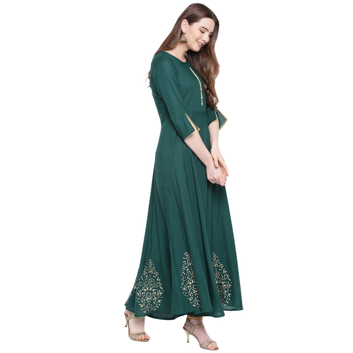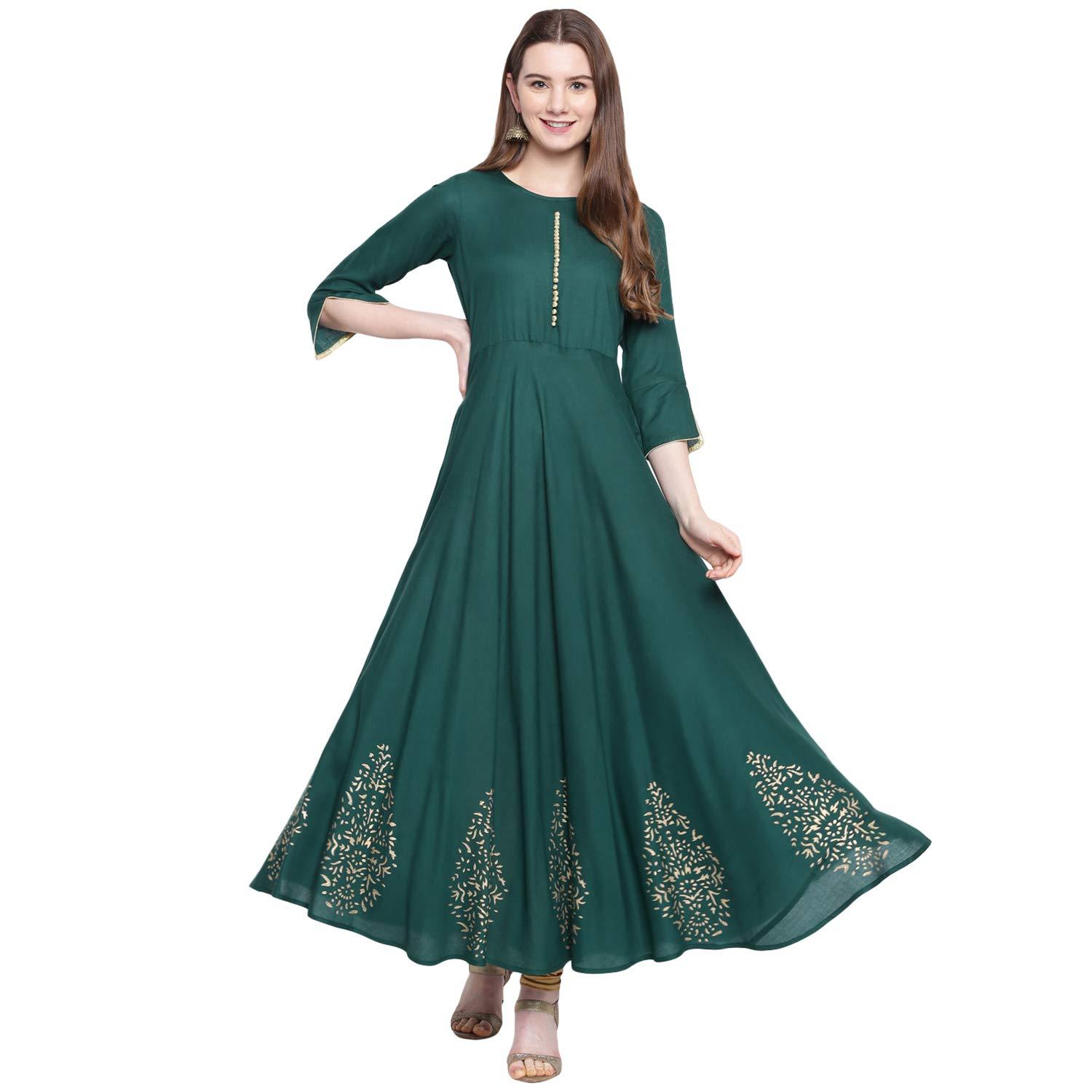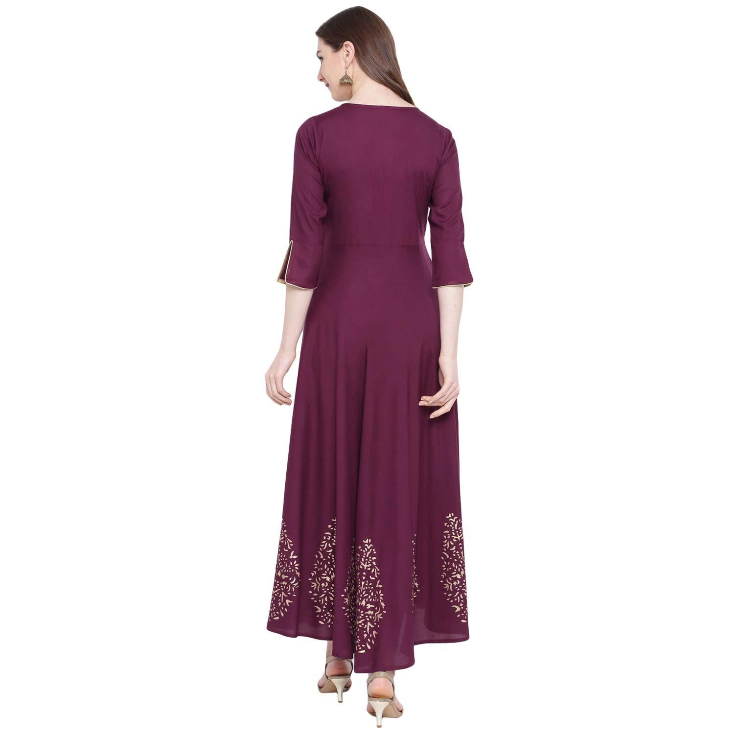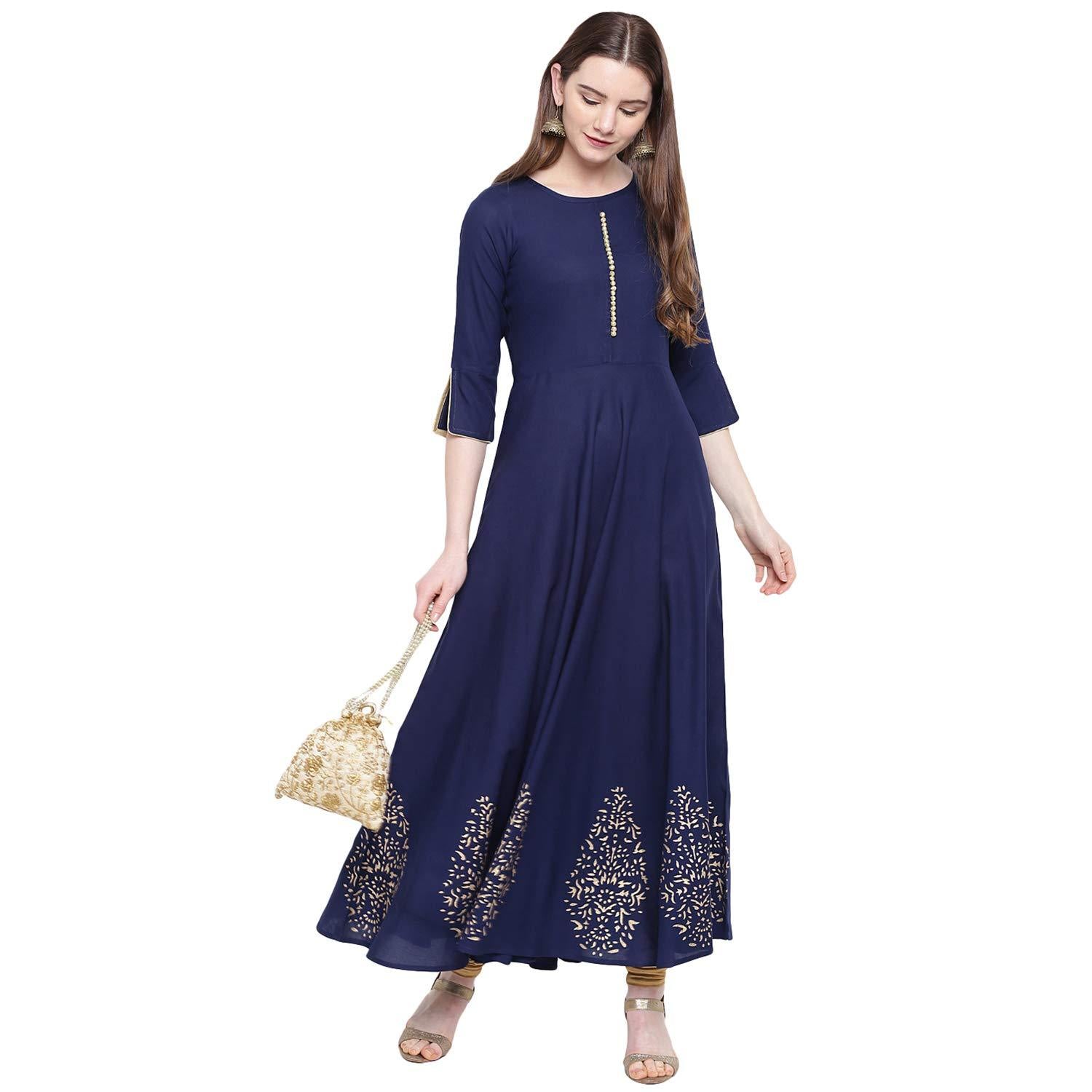 - Material:- Rayon || Style & Pattern :- Hand Block Gold Printed Kurta Dress || Length:- Ankle Length